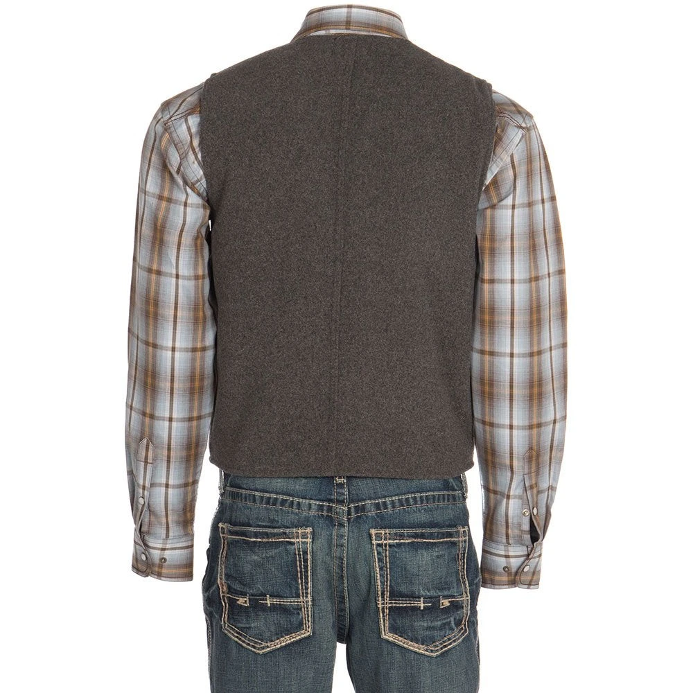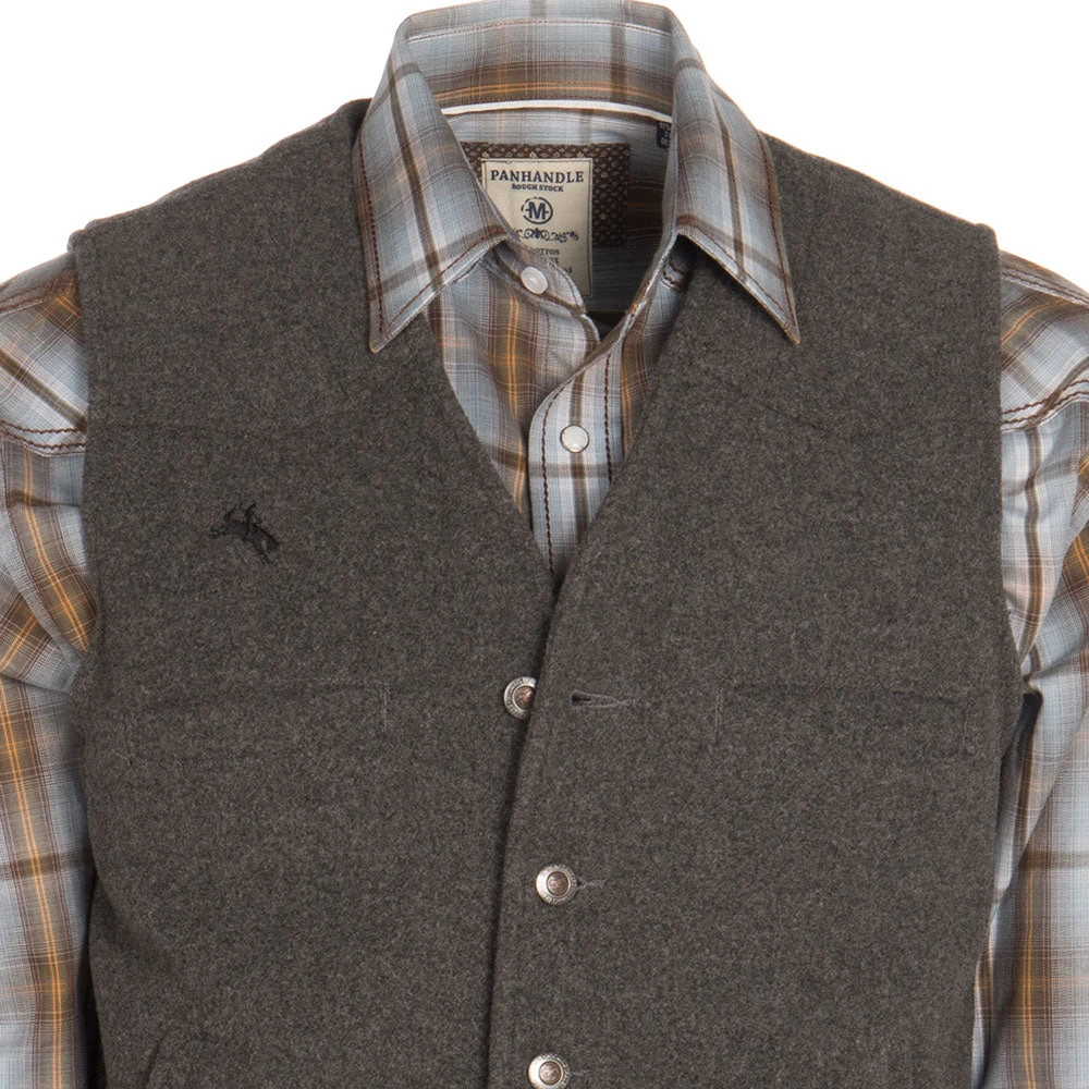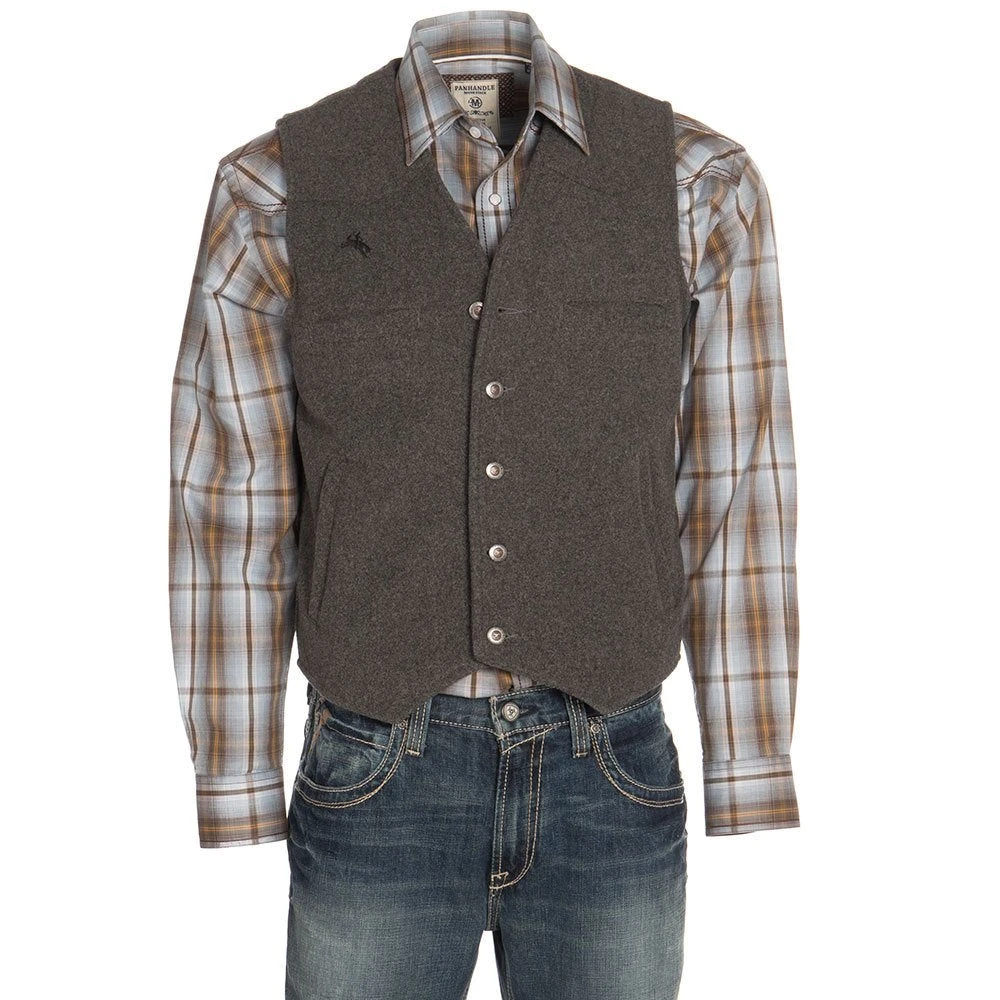The Wyoming Wool Vest is made from 20oz Australian Wool and is naturally water resistant. The vest has several unique elements, one being the front shoulder western yoke, an open v-neck with five buttons and the lower western cut front. The vest is lined with polyester satin lining and has two inside wallet pockets. The vest also has four front welt pockets, two for your hands and two chest pockets; all lined with cotton. The back of this popular vest has a french back seam that gives it just the right touch. Dry Clean only. VCM-CHAR